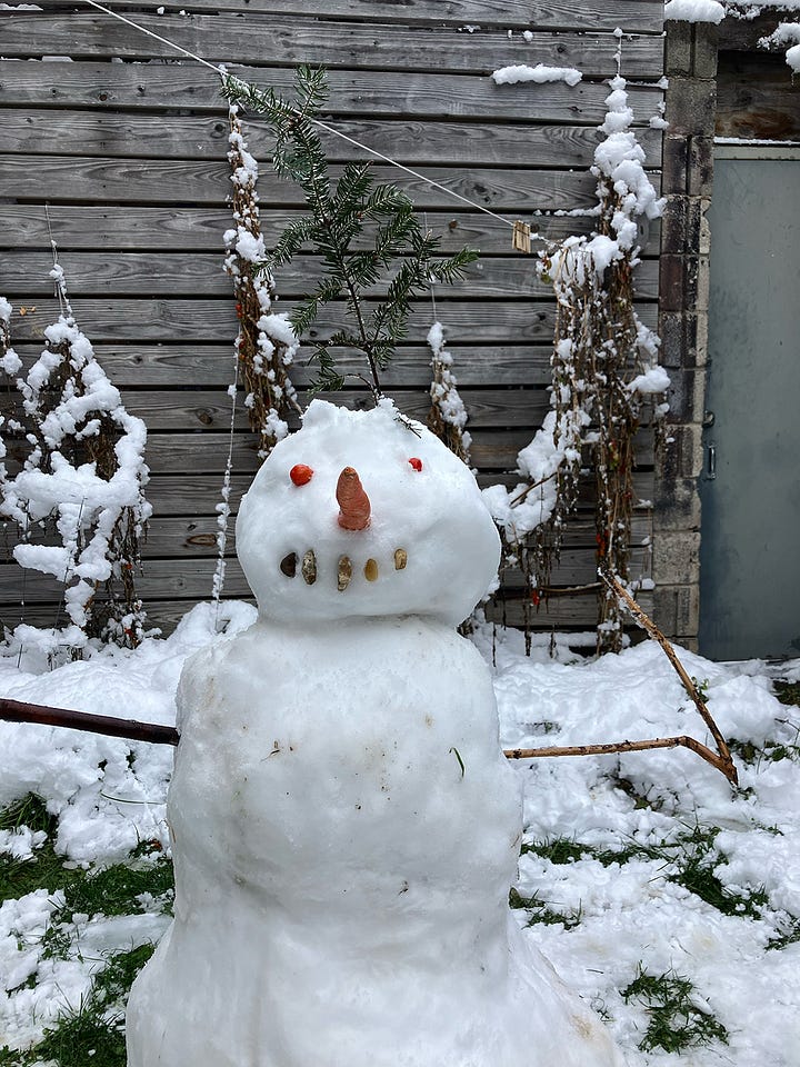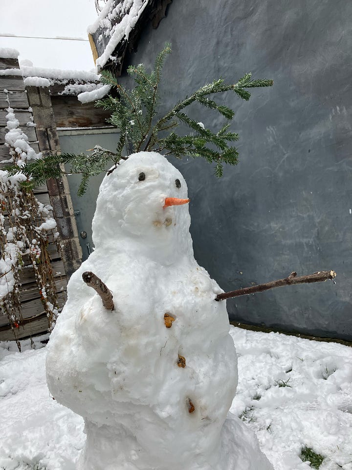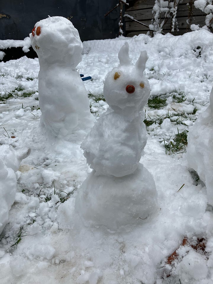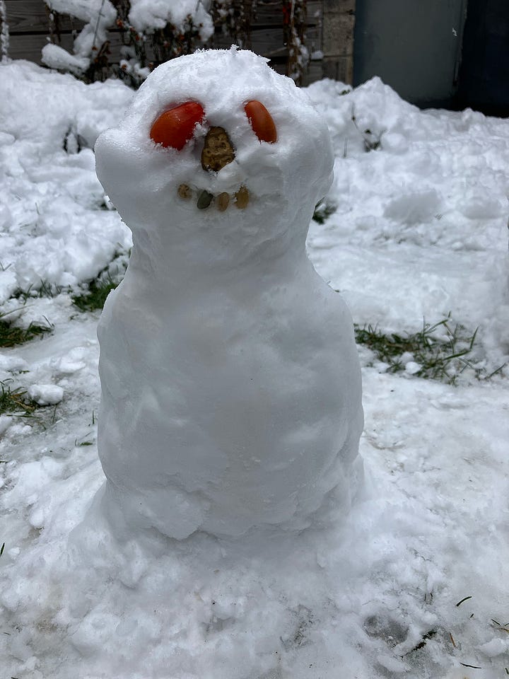 We made some snowmen this week. I did not want to go outside and build these snowmen, but I am so happy I did it. This little snow family brought me a lot of joy.